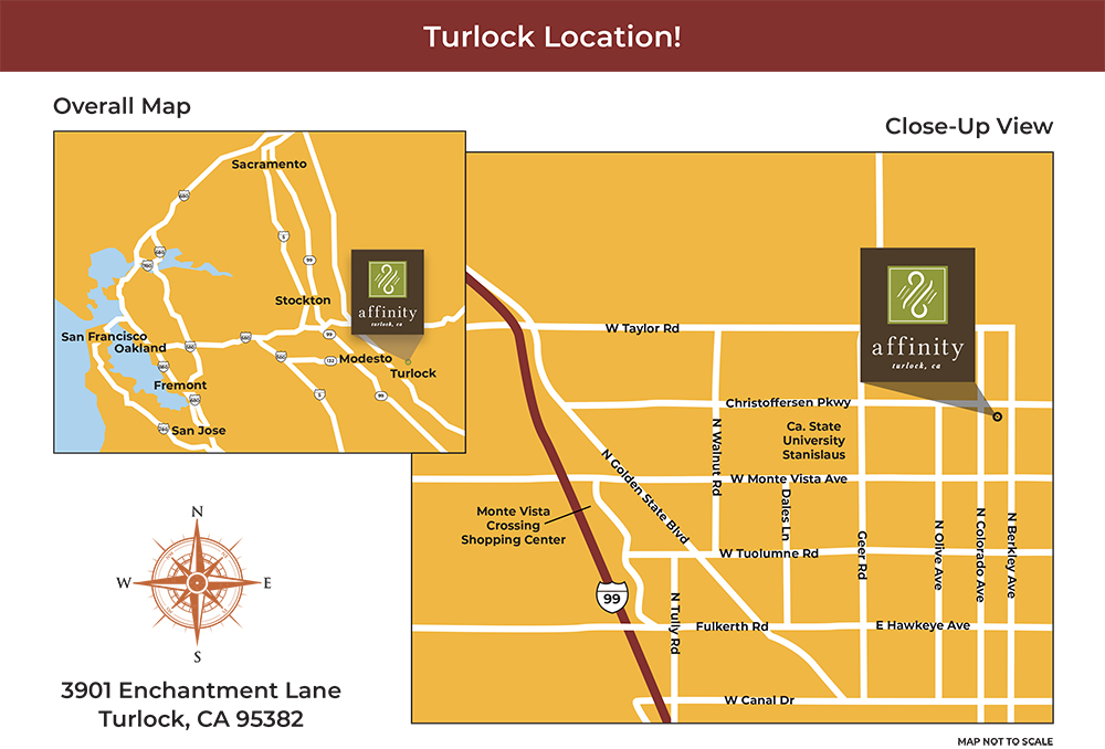 Affinity is just minutes from Blossom Valley Plaza with Raley’s and Monte Vista Crossing, where you’ll discover dozens of convenient shopping and dining options. Also, it’s just a short drive to charming downtown Turlock which provides a variety of local events along with one-of-a-kind retail and restaurants for everyone.