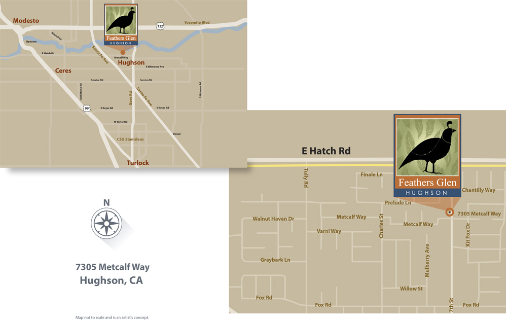 Gentle breezes and the pace of living in the country help to set Hughson apart from the bigger towns in the valley. Here you can still stroll down the quaint main street and feel your heart rate slow and your smile grow. The Central Valley’s premiere homebuilder, Florsheim Homes, invites you to tour Feathers Glen, a private enclave of just 39 homes total. Extra-large homesites and brand new single and two story plans were designed by the award-winning architectural firm of William Hezmalhalch. Homes range from approximately 1841 to 2587 square feet and offer the latest in technology and energy savings. Live big in the small town of Hughson!