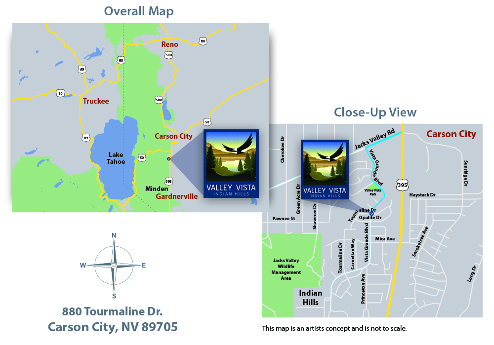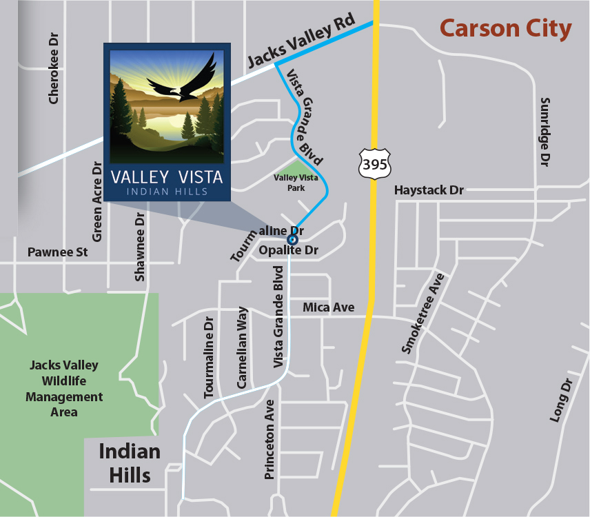 Close your eyes and picture the near perfect living environment — away from the hustle and bustle of bigger cities and nestled in the high plain of the Sierra Nevada mountains. Life here revolves around a temperate climate, with the picturesque mountains of Lake Tahoe in the distance, but very little snow on the ground. This is Valley Vista, a 36 home community in the Indian Hills area of Carson City, Nevada’s state capital. Residents of Nevada enjoy no state tax and low local taxes as well!