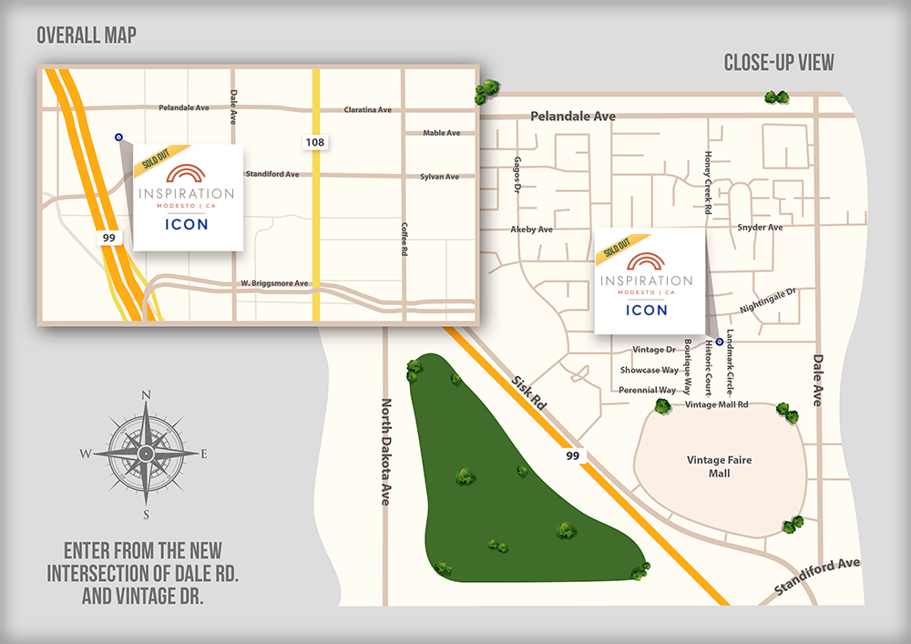 Location: 3112 Vintage Drive, Modesto ENTER FROM THE NEW INTERSECTION OF DALE RD. AND VINTAGE DR. MODELS ARE LOCATED ONE BLOCK NORTH OF THE VINTAGE FAIRE MALL. LOCATION MAP | AVAILABLE HOMESITES | BROCHURE | GALLERY