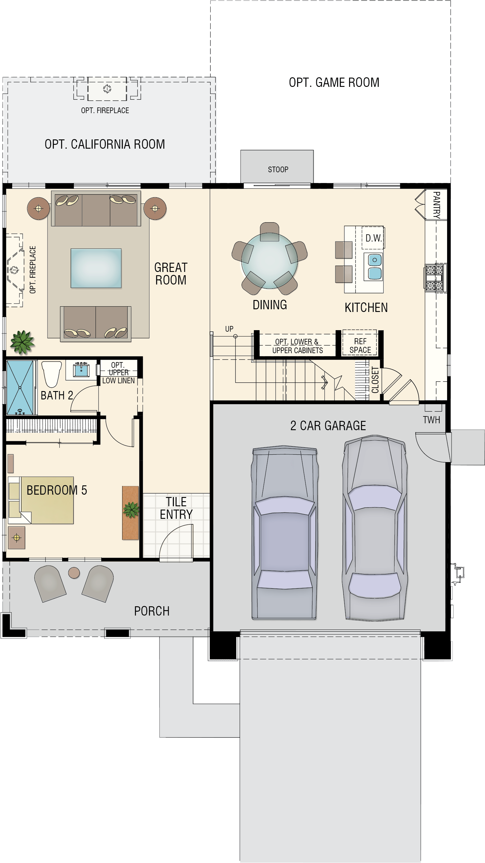 Florsheim Homes reserves the right to make modifications to elevations, floorplans and features without notice. Elevations and floorplans are artists' conceptual drawings and show upgraded landscaping. Square footages are approximate and vary per elevation, and options chosen. Porches, windows and room configurations vary per plan and elevation. Garage doors shown depict standard windows; however, front doors are sometimes shown with optional window upgrades and patterns.